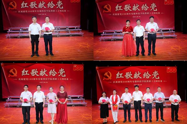 比赛现场,作为获奖单位代表刚刚参加中共安徽省委全省“两优一先”表彰大会的农学院党委书记何世潮向参赛教职工展示了全省“先进基层党组织”奖牌并发表获奖感言。在今年省委教育工委“两优一先”评选表彰中,我校詹秋文教授荣获“安徽省高校优秀共产党员”荣誉称号,许欣、耿广汉荣获“安徽省高校优秀党务工作者”荣誉称号,资源与环境学院环境科学与工程系教工党支部、人文学院中文系教工党支部荣获“安徽省高校先进基层党组织”荣誉称号。活动现场举行了我校“两优一先”表彰仪式,蒋德勤、李震、黄远友、王强、李升和等在校校领导为获奖单位和个人代表颁奖。通过表彰先进典型,激励、引导全校广大党员干部牢记初心使命、传承红色基因、永葆奋斗本色,团结一心、奋力拼搏,更好发挥基层党组织的战斗堡垒作用和党员的先锋模范作用,为描绘好新时代安科事业发展新画卷而努力奋斗。