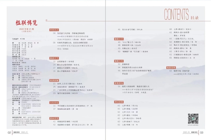 近年来,潜草诗社在校团委的指导下,坚持弘扬优秀传统文化,广泛开展文学创作和文化传承,社团举办的诗歌文化节、国学文化月、三行诗创作大赛等深入人心,吸引了全校文学爱好者积极参加,为浓厚学校文化氛围做出了积极贡献。此次集体亮相《楹联博览》,是社团在传统诗词创作领域深耕不辍的结果,也展现了我校社团建设的卓越成果。今后,校团委还将继续深入开展学生社团改革,充分发挥学生社团的育人功能,推动优秀文化在青年群体中的传承创新。(特约通讯员:张古品 审核:李刚)