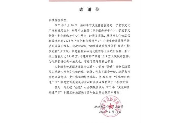 6月12日,蚌埠市文化体育旅游局致信我校,对我校建筑学院“拾遗”社会实践团队在2023年“文化和自然遗产日”非遗宣传展演展销活动做出的积极贡献给予赞扬,并对我校积极参与地方志愿服务活动表示感谢。