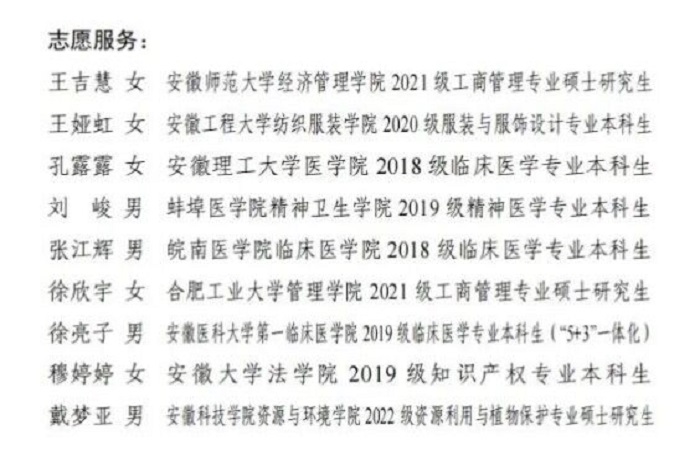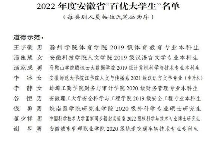 6月30日,由团省委、省委宣传部、省文明办、省教育厅、省学联等单位举办的2022年度安徽省“‘十佳’‘百优’大学生”评选结果揭晓。我校人文学院2019级汉语言文学汤佳慧同学荣获2022年度安徽省“百优大学生”(道德示范类)称号,资源与环境学院2022级资源利用与植物保护研究生戴梦亚同学获得“百优大学生”(志愿服务类)称号。