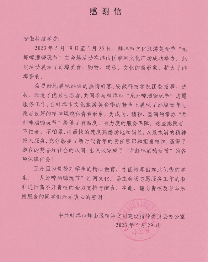 感谢信提到,乐动网页版登录入口_乐动网页版(中国)团委招募、选拔、派遣了优秀志愿者,共同参与蚌埠市“龙虾啤酒嗨玩节”志愿服务工作,在蚌埠市文化旅游美食季的舞合上展现了蚌埠青年志愿者良好的精神风貌和青春形象,为成功、精彩、圆满的举办“龙虾啤酒嗨玩节”提供了有温度、有力度的服务保障。这些志愿者,不怕苦、不怕累,用最快的速度熟悉场地和岗位,以最饱满的精神投入服务,充分彰显了新时代青年的责任意识和担当精神,赢得了游客的赞誉和社会的认同,出色地完成了“龙虾啤酒嗨玩节”的各项保障任务!正是因为贵校对学生的精心教育,才能培养出如此优秀的学生。“龙虾啤酒嗨玩节”淮河文化广场主会场志愿服务工作的顺利进行离不开贵校的全力支持与配合。在此,谨向贵校及参与志愿服务的同学们表示衷心的感谢。