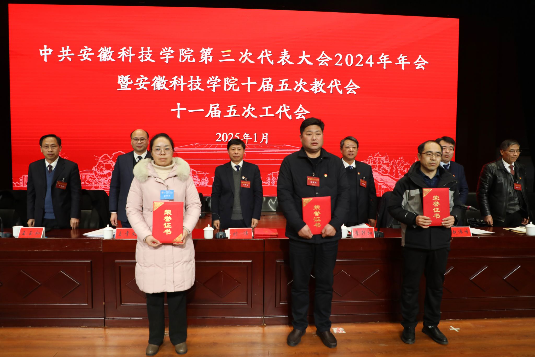 1月14日至15日,我校第三次党员代表大会2024年年会暨十届五次教代会、十一届五次工代会在凤阳校区大学生活动中心胜利召开。校党委书记时伟,党委副书记、院长李升和,党委委员、副院长王孝义,党委委员、副院长赵伟峰,党委委员、副院长王玉和,党委委员、机关党委书记卫胜,党委委员、党委组织部部长钱锐,党委委员、党委宣传(统战)部部长何永勇,校工会主席汪洋出席大会并在主席台就座。全体代表、列席人员和特邀人员参加大会。