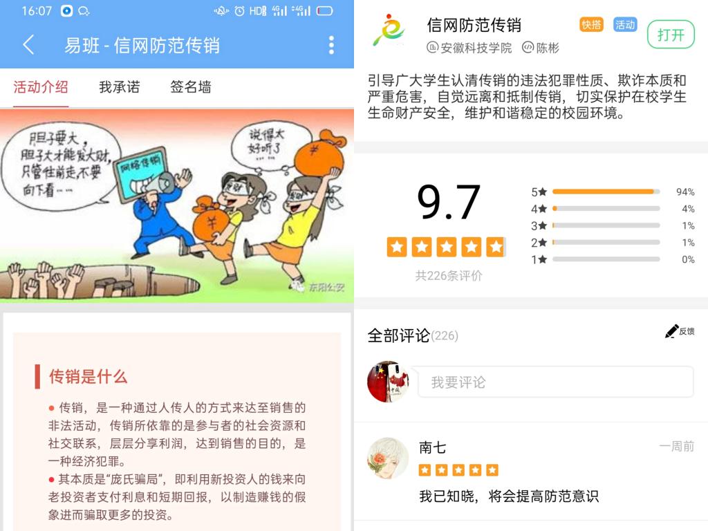 10月25-28日,学院在易班平台搭建了“信网防范传销倡议书”轻应用,充分利用知识学习模块将“金融传销”、“网络传销”、“旅游传销”、“国家工程”传销、“假冒直销企业”传销、“假慈善”传销等多种传销骗局进行线上案例展示。学院全体学生主动学习各类防范传销知识并签署倡议书,在学习防范诈骗知识的过程中,有226名学生围绕着传销的种类、危害等方面参与讨论。