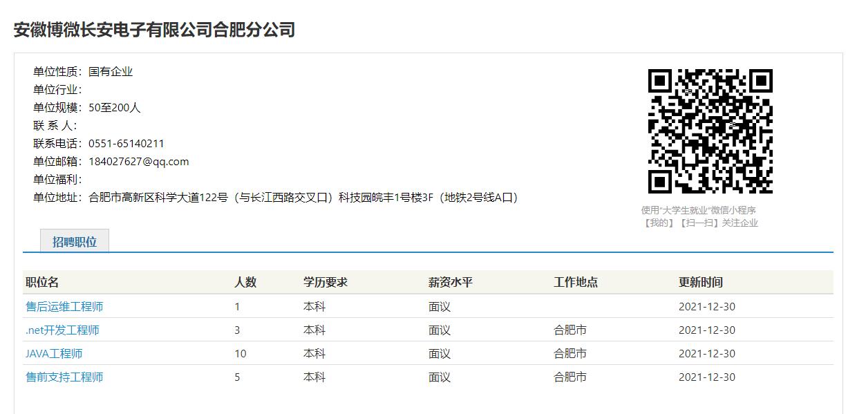 安徽博微长安电子有限公司公司合肥分公司(以下简称“博微长安合肥分公司”)于2017年设立,是博微长安公司从事粮食和物资储备等行业信息化、涉密信息化、信创工程集成开发与项目实施的专业领域,致力于打造成为博微长安民品产业创新基地、信息化产业新动能基地、对外窗口和人才聚集地,位于高新区科学大道与长江路交口,交通便利。 博微长安合肥分公司聚焦粮食与物资储备信息化、涉密及信创工程两大板块业务。同时,承担博微太赫兹、38所通信、对抗领域配套业务,是安徽省“智慧皖粮”信息化项目建设的主力军,累计签订合同额1.5亿元。福建、河南、山西、江西等外省信息化市场开拓成效显著,累计签订合同额5000万元。取得发明专利、实用新型专利和软件著作权证书37项,拥有计算机系统集成资质二级、安全防范行业资质证书二级。公司是博微子集团内唯一拥有涉密甲级资质企业,信创工程唯一入围集成商。