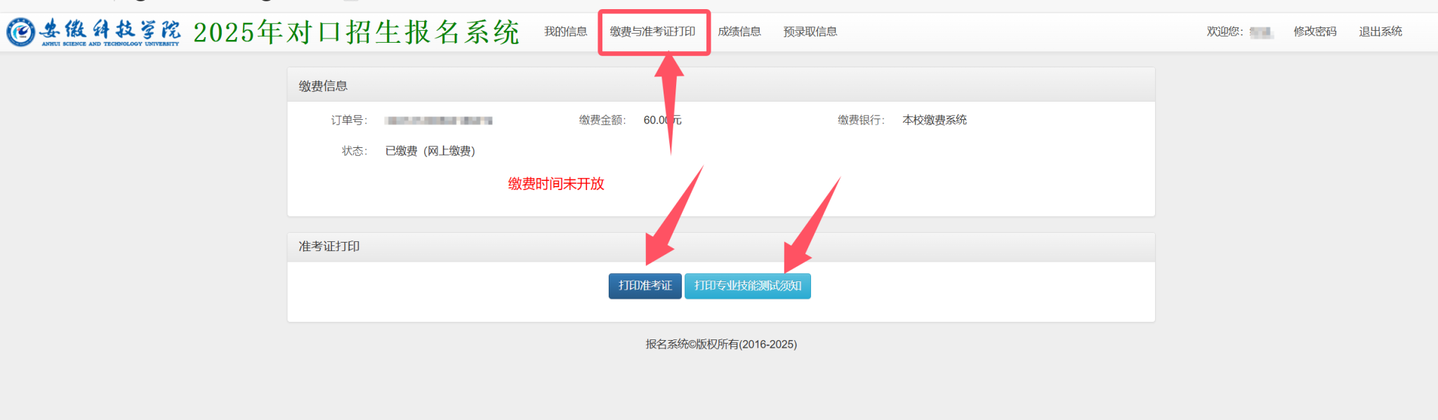 第三步:登录后,选择缴费与准考证打印,依次打印考生准考证和专业技能测试须知。
