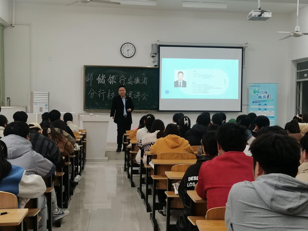 为贯彻落实全国高校2023届毕业生就业工作第二次视频调度会议精神和教育部“春季促就业攻坚行动”部署及学校就业推进会要求,3月23日下午,财经学院邀请中国邮政储蓄银行安徽省分行来校举办春季校园专场招聘宣讲会。中国邮政储蓄银行宿州市分行、淮北市分行、蚌埠市分行招聘工作负责人,学院2015届优秀毕业生代表、现任宿州市分行公司金融部副总经理聂佑东出席会议。财经学院2023届毕业生及龙湖校区其他对口专业毕业生100余人参加宣讲会。