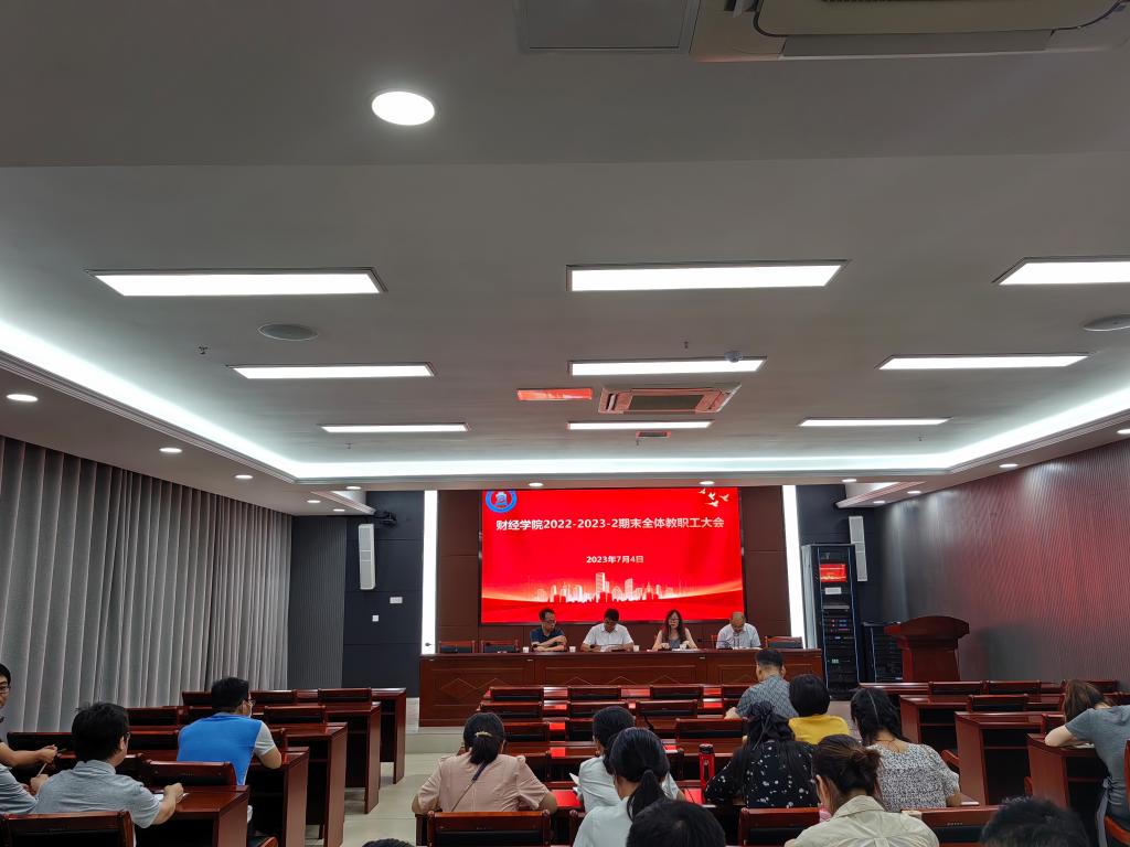 7月3日下午,财经学院在西辅楼111召开2022-2023第二学期期末教职工会议。学院党政领导班子成员及全体教职工参会,会议由院长郝世绵主持。