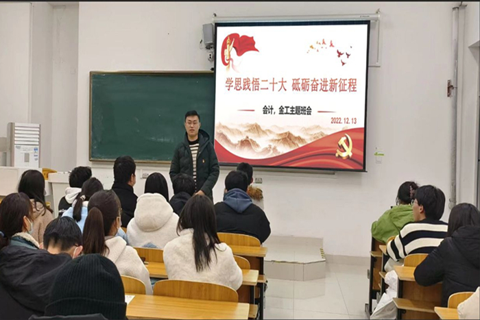 为深入学习贯彻党的二十大精神,全面领会党的二十大报告的重大意义、丰富内涵和精神实质,进一步加深对习近平新时代中国特色社会主义思想的理解,营造学习宣传贯彻党的二十大精神的浓厚氛围。12月9日-14日,财经学院各班级组织开展了以“学习党的二十大,青春建功新时代”为主题的班会。