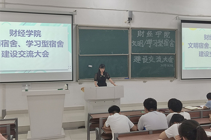为深入学习贯彻习近平新时代中国特色社会主义思想,树立学生学习生活榜样,倡导文明言行爱校如家,切实加强学生公寓安全管理,营造文明、和谐、安全、舒适的学习生活环境,财经学院于5月31日下午在致知楼B111教室召开文明宿舍、学习型宿舍创建交流大会。学院党委副书记、纪委书记耿广汉出席会议。会议由辅导员丁雨妍主持。学院各班级寝室长参加了会议。