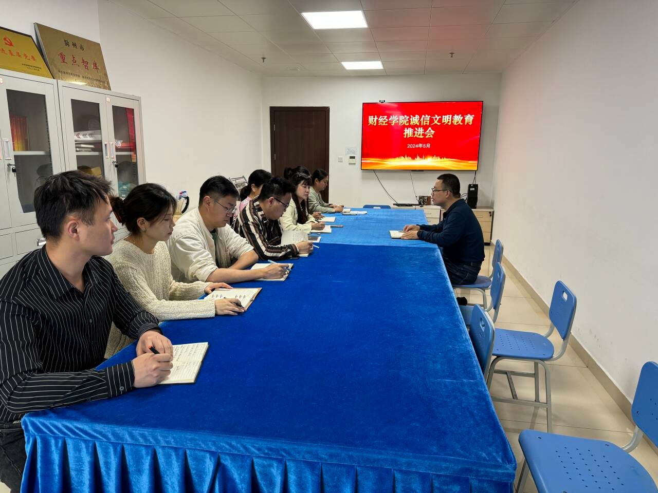 为落实立德树人根本任务,深化中华民族诚信美德,营造实事求是、诚信考试氛围,5月13日下午,财经学院召开诚信文明教育工作推进会。学院党委副书记、纪委书记耿广汉主持,全体辅导员老师参会。