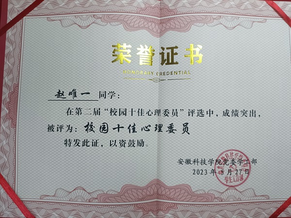 学校于5月27日下午在凤阳校区图书馆二楼报告厅举行第十八届“5 25”大学生心理健康月活动闭幕式暨第二届校园十佳心理委员评选答辩及颁奖,我院赵唯一同学表现出色,脱颖而出,荣获“校园十佳心理委员”荣誉称号。