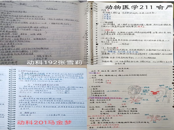 上交的笔记囊括了兽医微生物学、动物生理学、动物解剖学等课程。有的笔记字迹飘逸洒脱,标识清楚详尽;有的用不同颜色的笔区分知识点的重要程度,在重点知识旁做下详细的备注并加上自己的理解与认识,方便知识的复习和巩固。透过这些详细的批注,脑海中浮现出同学们认真听课的情景。每一本课堂笔记都显现出每位同学不同的学习方法,都彰显每位同学对于不同课程不同知识点的理解与思考。