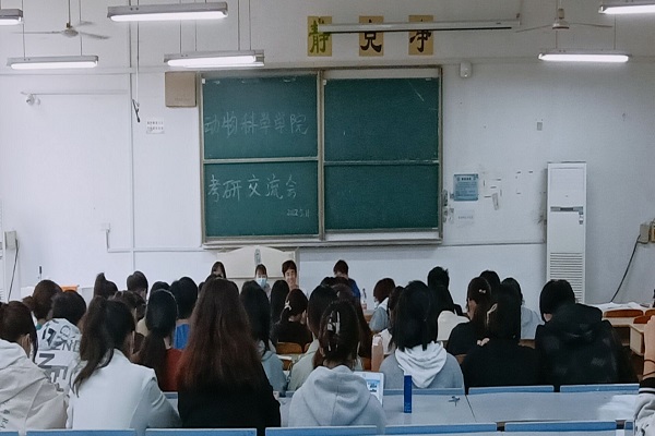 为给2023考研人提供答疑平台,促进学风建设,5月11日下午,动物科学学院针对19、20级动物科学、动物科学(对口)、动物医学专业意向考研学生在求A分教室举办考研经验交流会。刘杨子、张梦玲、刘梦园、鹿震涛、岳梦龙、凌敏、冯幼书、孙祁等八名同学受邀主讲。党委副书记、纪委书记汤帅,辅导员胡文丽出席活动。