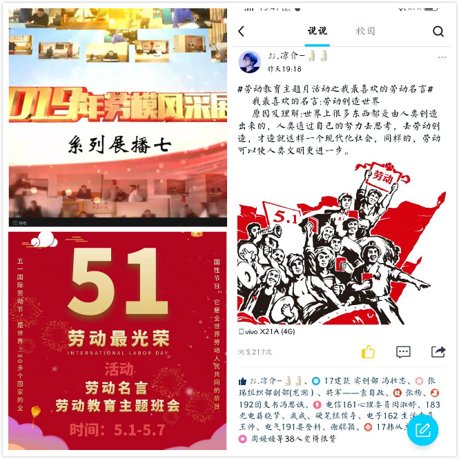 本次活动分为两部分,一是各班召开劳动教育主题班会,观看“2019年劳动模范事迹”,各班级根据参赛要求,踊跃报名,班级同学一起观看“2019年劳模风采展播”、“听劳模讲故事”等视频,电气工程及其自动化192班班长谢英豪反馈道:学习了劳动模范的先进事迹后,班级同学纷纷表示要向他们学习;二是参赛同学在QQ空间发表关于“马克思主义劳动观”说说,并在评论里说明自己对马克思主义劳动观的理解,同学们纷纷行动起来,读原著、悟原理、讲感受。