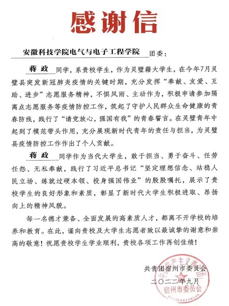 10月12日上午,共青团乐动网页版登录入口_乐动网页版(中国)电气与电子工程学院委员会收到一封来自共青团宿州市委员会的感谢信。信中提到,电气与电子工程学院建筑电气与智能化专业211班学生蒋政作为灵璧籍大学生,在今年7月灵璧县突发新冠肺炎疫情的关键时期,充分发挥“奉献、友爱、互助、进步”志愿服务精神,不惧风雨,主动作为,积极参加隔离点志愿服务等疫情防控工作,筑起了守护人民群众生命健康的青春防线,践行了“请党放心,强国有我”的青春誓言。