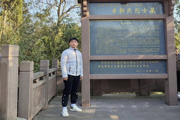 1月30日,电气与电子工程学院光电信息科学与工程专业224班施森磊于余姚市卓新民烈士墓陵参加寒假社会实践活动。