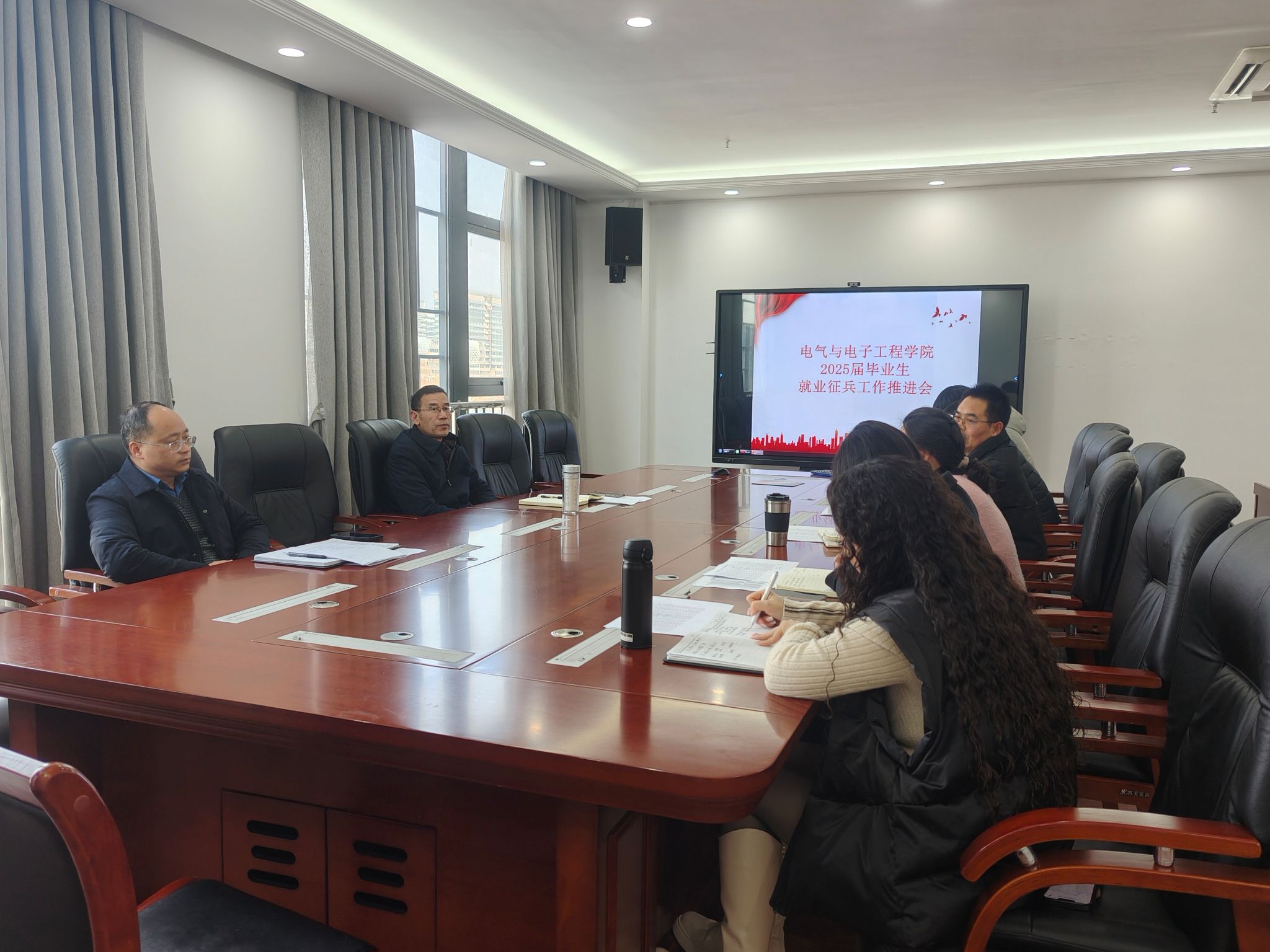 为进一步做好2025届毕业生就业征兵服务工作,12月20日下午,电气与电子工程学院在西辅楼317会议室召开2025届毕业生就业征兵工作推进会。学院党委书记骆海邦,党委副书记、纪委书记尚磊及相关毕业班辅导员参加会议。