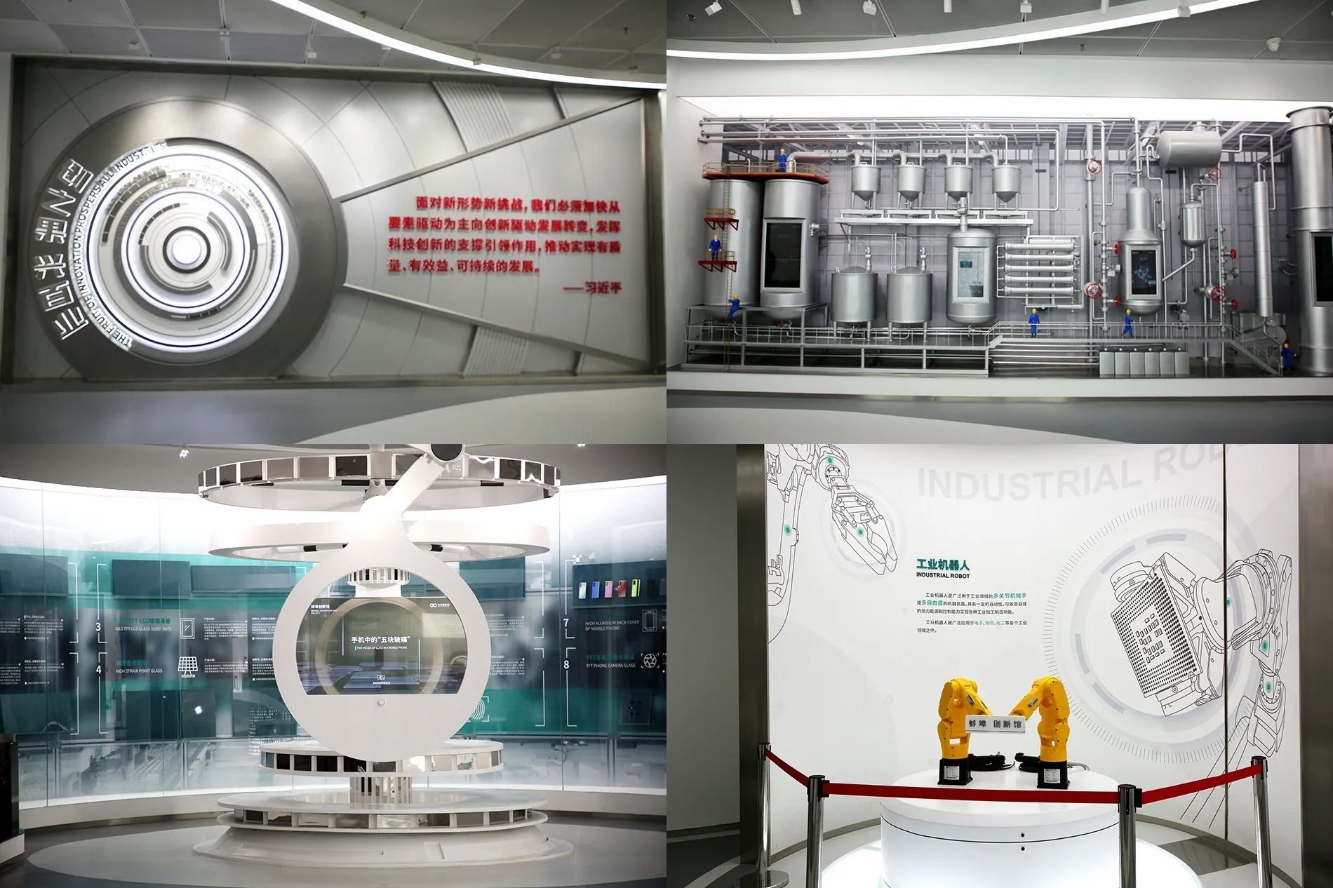 蚌埠创新馆是蚌埠市创新成果对外展示的综合性平台。参观的师生进入展厅后,先观看了环幕影片《创新之城·拥抱未来》,了解到蚌埠科技创新的整体情况。随后参观主题为“创之光·耀珠城”的一层展区,参观师生沉浸在观影空间中,了解蚌埠的重大创新成果和历史事件。在二层展厅中,柔性可折叠玻璃等一系列创新成果的展示引起参观师生的阵阵惊叹。在三层展区的聚乳酸生产线和互动区域,通过模型、艺术装置、数字沙盘以及声光电等多媒体手段为前来参观的师生提供了近距离了解科学原理和创新研发的平台。最为推荐的是未来时空影院,师生们身处于未来世界的既视感,在这里我们跟随影片一起沉浸式漫步于未来时空,邂逅科技创新的魅力。