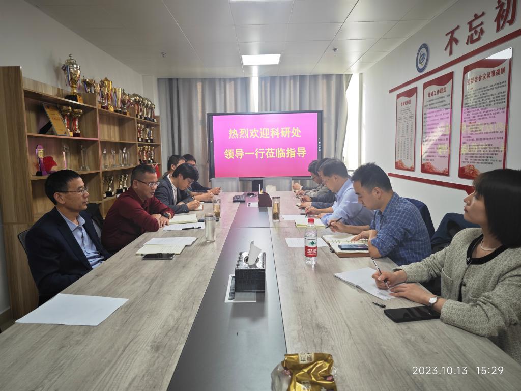 夏显明从学院高水平人才引进、科研项目申报、科研平台建设、产学研合作、经费到账情况、2024年国家基金申报等方面作了全面介绍,就目前科研工作中存在的亟需科研处协助解决的问题以及科研工作未来发展改革思路作了详细汇报。