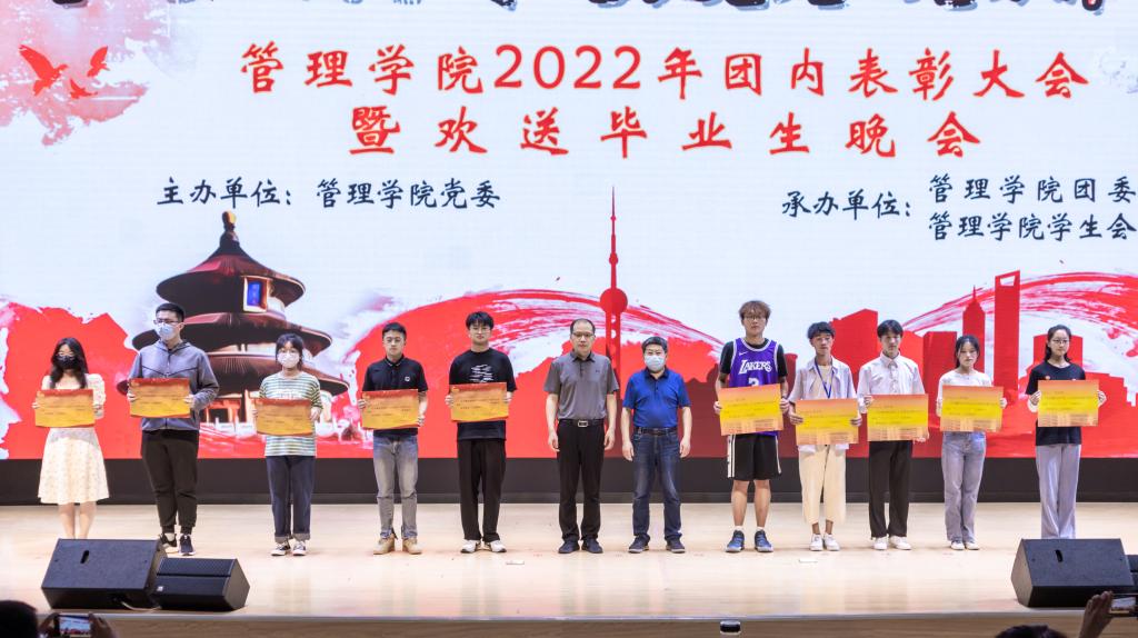 5月28日晚7时,管理学院2022年团内表彰大会暨欢送毕业生晚会在东辅楼报告厅举行。管理学院党委书记丁景良,党委副书记、院长陈传万,党委副书记陶漫,党政办公室主任李永鹏,团委副书记方辛,团委副书记江旭聪等应邀出席观看了晚会并为获得2022年团内表彰的人员颁奖。