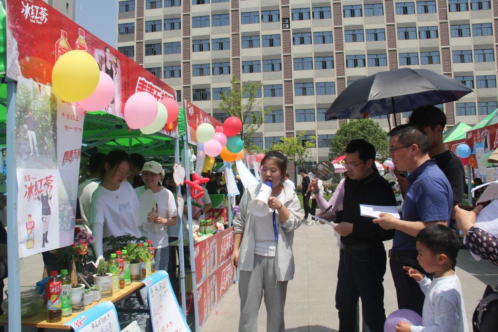 为进一步提高应用型人才培养质量,强化学生实践创新能力,丰富学生营销实践经验,夯实创业教育工作。5月9日上午十时起,由管理学院组织举办的第三届“冰红茶”创意营销大赛在龙湖校区德馨苑五栋前门广场拉开帷幕,管理学院院长赵伟峰,副院长张国宝亲临现场指导,赛事评委由统一集团皖北区域总经理王道端、工商管理系主任程业炳教授和市场营销系刘菊副教授担任。