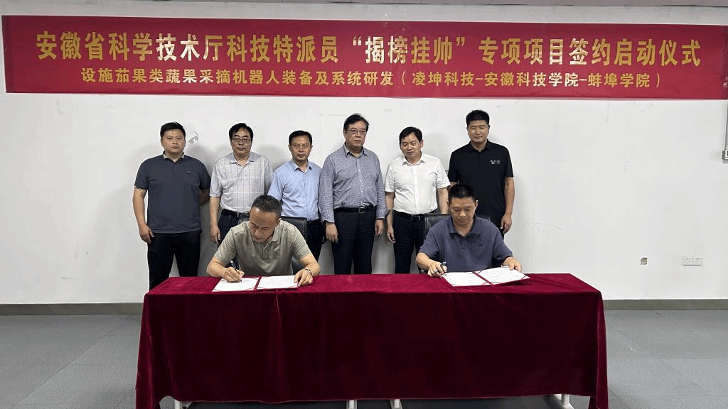 安徽省科学技术厅科技特派员“揭榜挂帅”农业物质技术装备专项项目,属于安徽省科技重大专项项目,我校机械工程学院材料成形及智能装备团队申报的“设施茄果类蔬果智能采摘机器人装备及系统研发”获批立项,这也是乐动网页版登录入口_乐动网页版(中国)首次获批省级揭榜挂帅项目;该项目省级支持资金100万,地方按照1:1配套资金。2023年6月2日,发榜方和揭榜方在安徽凌坤智能科技有限公司举行项目启动和各方责任履约签约仪式,蚌埠市科技局副局长杨怀波、乐动网页版登录入口_乐动网页版(中国)科研处处长陈丰、安徽凌坤智能科技有限公司董事长潘成刚等参加签约启动仪式。