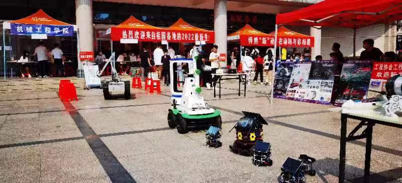 在迎新现场,一名大一新生正在跟学长进行“智能自主移动机器人”交流和学习。这9台机器人是机电控制工程系周玉强老师带领机器人工程专业本科生,从元器件选型到硬件调试,再到控制系统,一直到应用系统,每一步都是学生自己亲自动手完成的,极大地提高了本专业学生对机器人复杂工程的分析和解决能力。