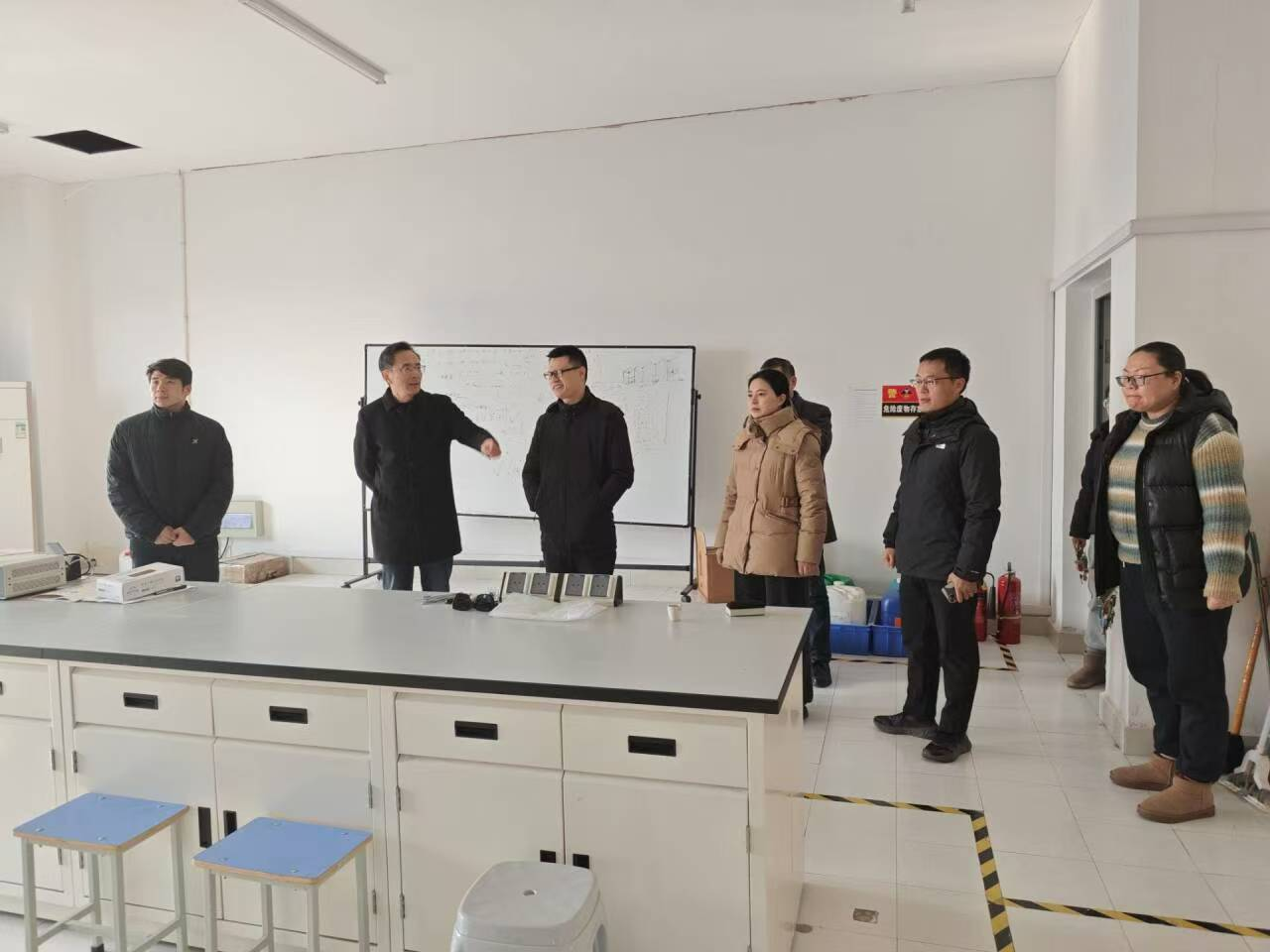 检查中,班子成员详细了解了实验室设备运行状况、安全管理措施以及实验室卫生状况,重点检查了危险化学品存储、气体钢瓶摆放、高温炉运行情况以及消防设备配置等关键环节。对实验室中存在的问题逐一记录并反馈给实验室相关负责人,立行立改,确保各项指标符合相关安全标准。