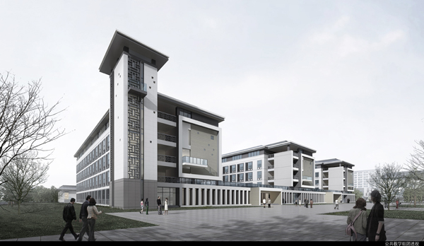 建筑色调上以灰色金属顶、浅色及暖色真石漆墙面、搭配白色与浅灰色以及仿木色高弹涂料、配合金属,造型简洁又富含传统元素,形成典雅精致的校园文化建筑形象。