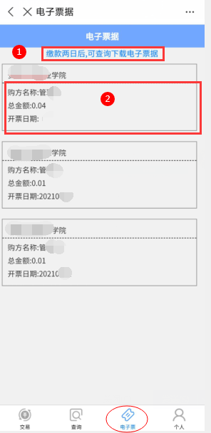 1.点击下方的“电子票”菜单,进入电子票据界面