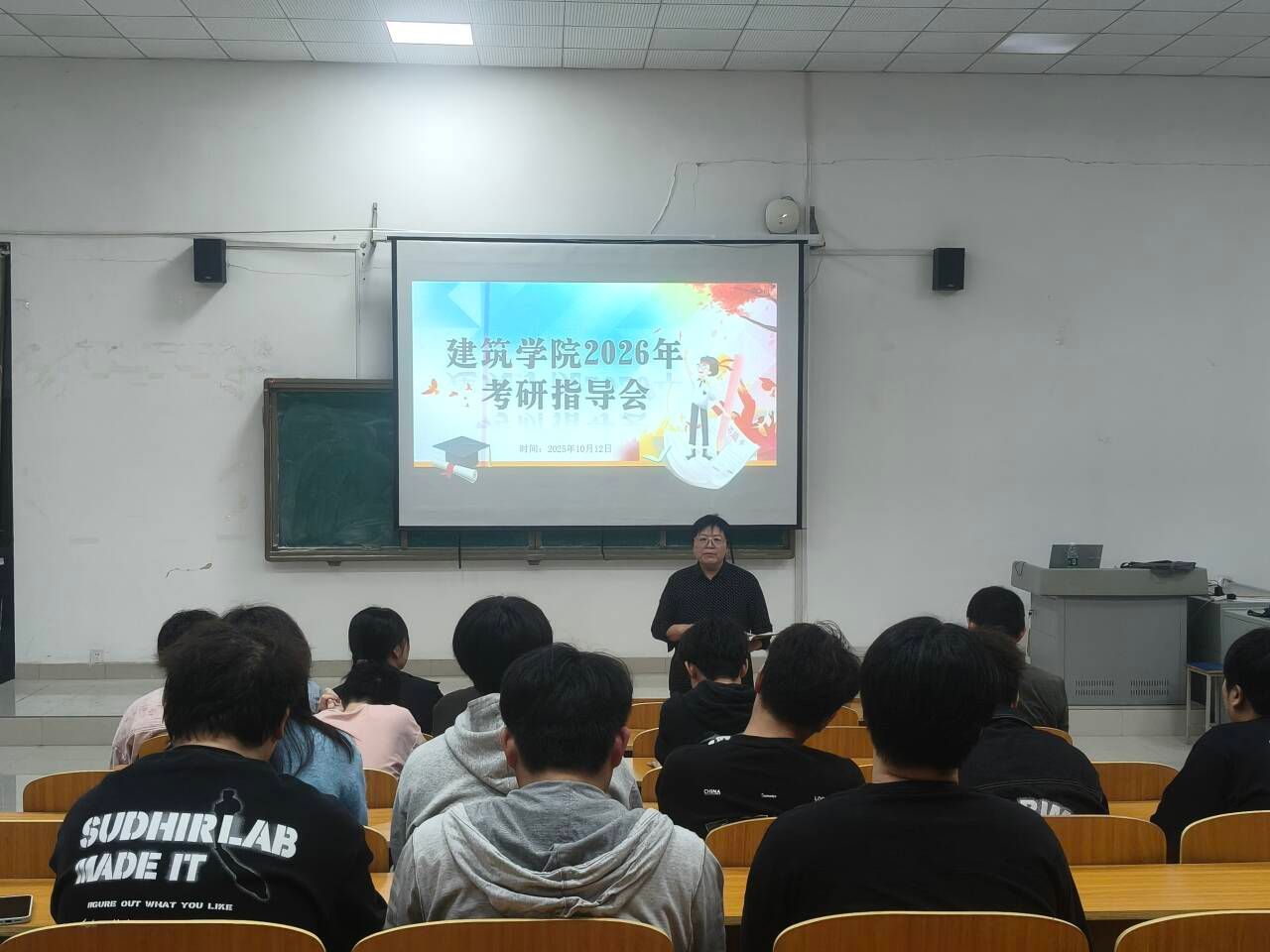 为帮助考研学生深入了解考研形势,进一步坚定备考信心,10月12日下午建筑学院在敏C102教室举办2026届毕业生考研指导会,拟报考2026年硕士研究生的学生参加。会议由学院党委副书记谢宜勤主持,学院副院长张伟主讲。
