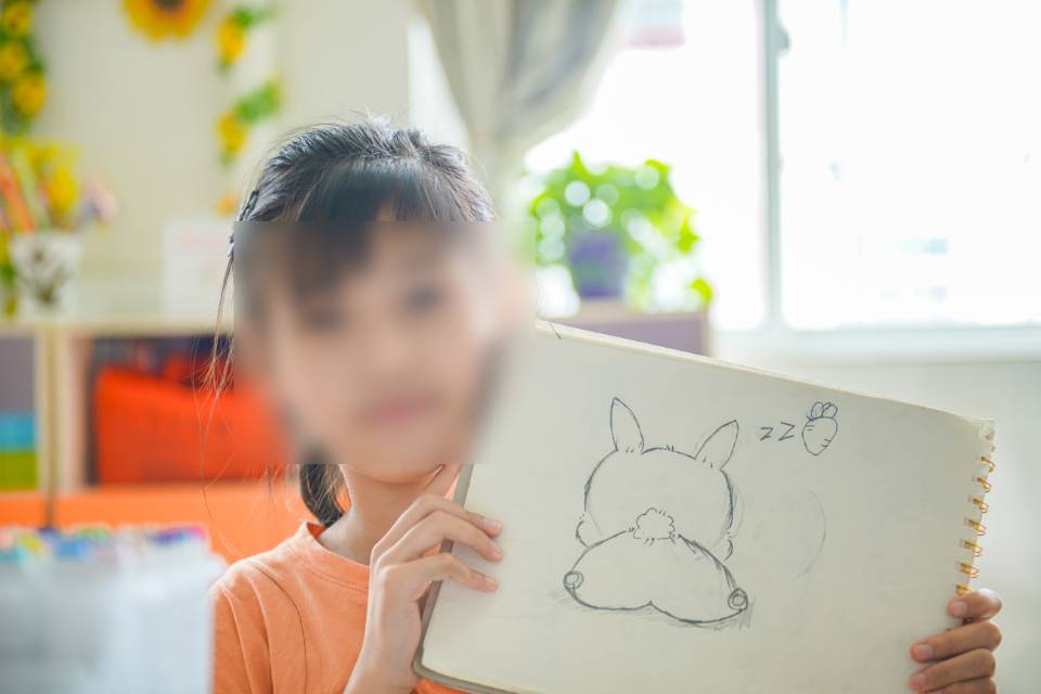 神奇的变脸玩具吸引了孩子们的目光,团队成员黄苏琳通过变脸文化演示文稿讲述变脸传统文化,激发孩子们对变脸艺术的兴趣,面对大屏幕上从未见过的变脸艺术,纷纷惊叹不已。在他们对变脸玩具跃跃欲试的时候,团队成员黄苏琳像玩魔术一般,将自制的变脸纸杯半成品展现在大家面前,孩子们需要做的是开动脑筋,自己绘制变脸纸杯中的多样表情。孩子们认真思考、投入其中,不时模仿着自己绘制的搞怪可爱的表情,并与作品来个合影。