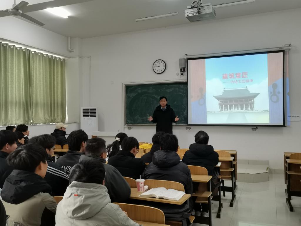3月22日下午建筑学院副院长吴伟东深入2021级建筑学班级召开主题班会,并为同学们讲授了题为《建筑意匠——传统工匠精神》的思政课。