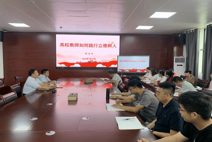 7月12日,院长张远兵以《高校教师如何践行立德树人》为主题,为学院教研室主任、实验室主任讲授专题党课。他从习近平总书记关于教育的重要论述、学院教师先进典型、违反高校教师职业行为准则案例、新时代高校教师职业行为十项准则等方面,明确教师在高校落实立德树人根本任务中的角色和使命,进一步加强师德师风建设。张远兵提到,要把立德树人贯穿到教育的各个环节中,担负起教师的责任与义务,将习近平新时代中国特色社会主义思想融入到教育教学中,努力成为业务精湛、学生喜爱的高素质教师。教师作为知识的传授者、价值观的塑造者、人类文明的传承者,肩负着立德树人的重要责任。在未来的工作中,教研室主任、实验室主任要率先严于律己,敬业爱生,向先进典型教师学习,争做“四有好老师”。