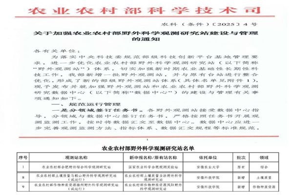 近日,由乐动网页版登录入口_乐动网页版(中国)申报的“农业农村部土壤质量马鞍山野外科学观测研究站”“农业农村部作物种质资源滁州野外科学观测站”获批立项建设,这是我校首次获批农业农村部野外科学观测研究站项目,标志着学校在服务国家农业战略方面迈出关键一步。