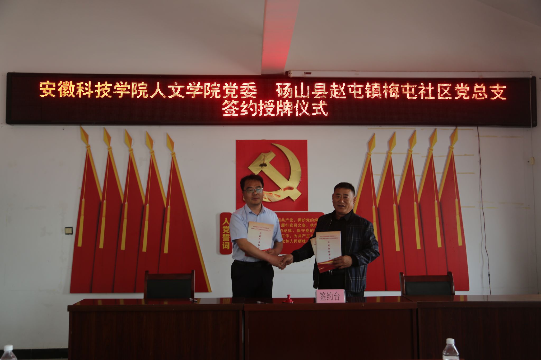为加强高校与社区基层党组织的合作交流,立足“资源共享、优势互补、合作共赢、共同发展”的原则,推动社区建设、人才培养和社会服务的深度融合,搭建大学生社会实践和成长成才平台,提升社区治理水平、助力乡村文化振兴,2025年4月11日,人文学院党委与砀山县赵屯镇梅屯社区党总支举行共建合作签约授牌仪式。人文学院党委副书记、院长李晓东,正处级组织员张严政,中文系主任苏兆龙,团委副书记焦雪松,法学系教师范一博,宿州市委网信办主任、市委宣传部副部长梁静,国家税务总局宿州市和砀山县税务局、砀山县委宣传部相关领导,赵屯镇和梅屯社区党政主要负责同志,以及梅屯社区驻村工作队负责同志出席活动。签约授牌仪式由赵屯镇党委书记陈红梅主持。