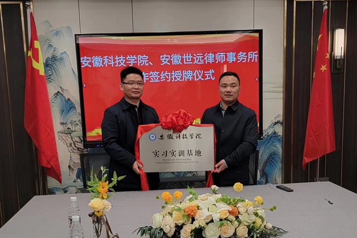 李晓东代表学院与安徽世远律师事务签署实习实训基地协议,牛永辉向安徽世远律师事务所授予“乐动网页版登录入口_乐动网页版(中国)实习实训基地”牌匾。(特约通讯员:高晓宁 摄影:高晓宁 审核:牛永辉)