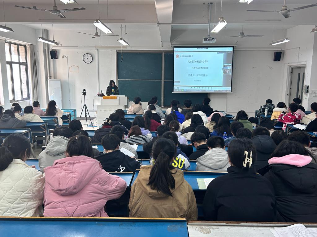 讲座中,陈丹丹紧扣新时代中国特色社会主义法治建设主旋律,以“宪法框架中的权力与权利--行政诉讼的权利保障”为主旨,从宪法体系、个人权利、国家权力、行政诉讼的权利保障等方面,深入阐释了以宪法为核心的中国特色社会主义法律体系。“没有无义务的权利,也没有无权利的义务”以《中华人民共和国宪法》的相关法律条文解读,向同学们详细地介绍了《中华人民共和国宪法》中“公民的基本权利和义务”。此外,更通过详实的材料和生动的案例,并结合实际工作和生活中的亲身经历,向同学们阐述了国家权力和行政诉讼的权利保障的重大意义。