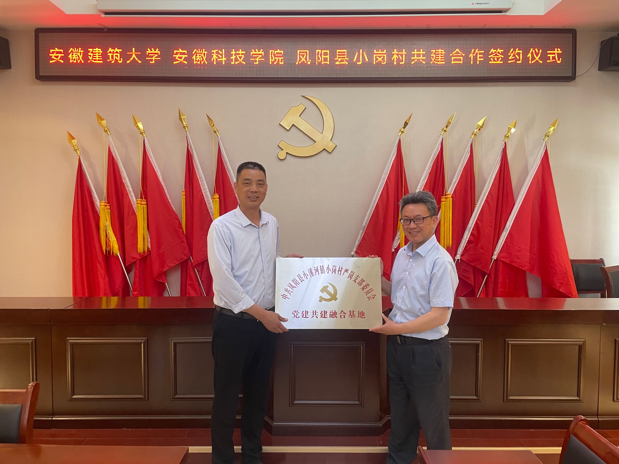 根据乐动网页版登录入口_乐动网页版(中国)《关于进一步深化与凤阳县小岗村战略合作助力乡村振兴实施方案》和《2024年深化与凤阳县小岗村合作推动乡村治理重点工作安排》,为充分发挥人文学院党委“全省高校党建工作标杆院系”和全省高校“双带头人”教师党支部书记工作室的引领辐射作用,深化校地全面合作,助力小岗村基层党建提质增效与融合发展,在学校与凤阳县小岗村战略合作领导小组办公室(以下简称“校小岗合作办”)和党委组织部、宣传部的牵头协调和精心组织下,5月15日下午,人文学院党委携手安徽建筑大学公共管理学院党委,与小岗村严岗党支部联合开展结对共建,在小岗村党员活动室举行党建共建合作签约暨党建共建融合基地揭牌仪式。我校党委委员、校小岗合作办常务副主任、机关党委书记卫胜主持仪式,党的二十大代表、小岗村党委书记、村委会主任周群之,人文学院党委副书记、院长李晓东,安徽建筑大学公共管理学院党委委员、副院长连瑞瑞出席仪式并讲话。