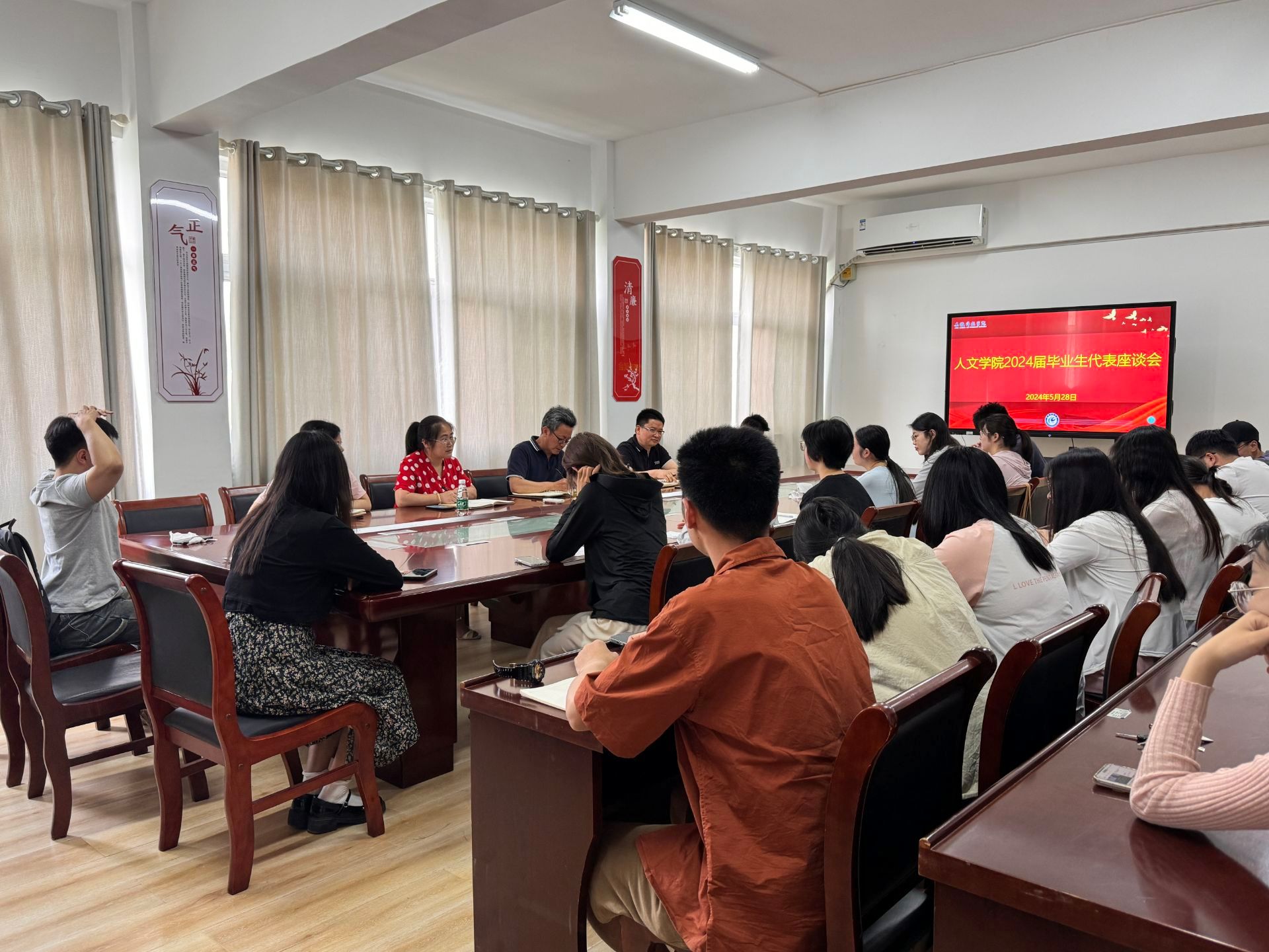 为充分了解2024届毕业生学习、生活和就业情况,倾听毕业生心声,征求他们对学院和学校发展及管理、服务工作的意见与建议,进一步增强教学育人、管理育人和服务育人的针对性与实效性,5月28日下午,人文学院在学知楼324会议室召开2024届毕业生代表座谈会。学院正处级组织员张严政、副院长牛永辉、党委副书记李沙娜及毕业班辅导员、各专业毕业生代表等参加座谈交流。会议由李沙娜主持。