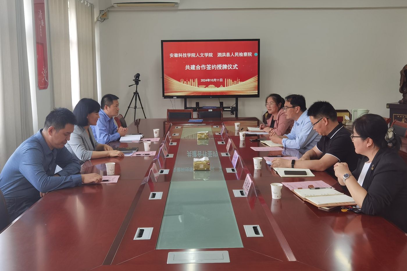 10月11日下午,泗洪县人民检察院党组书记、检察长柳梅,党组成员、副检察长王晓刚,第六检察部副主任江荣香一行来校签署共建合作协议;人文学院党委副书记、院长李晓东,副院长牛永辉,党委副书记、纪委书记李沙娜,法学系主任张晓云出席仪式。仪式由李沙娜主持。