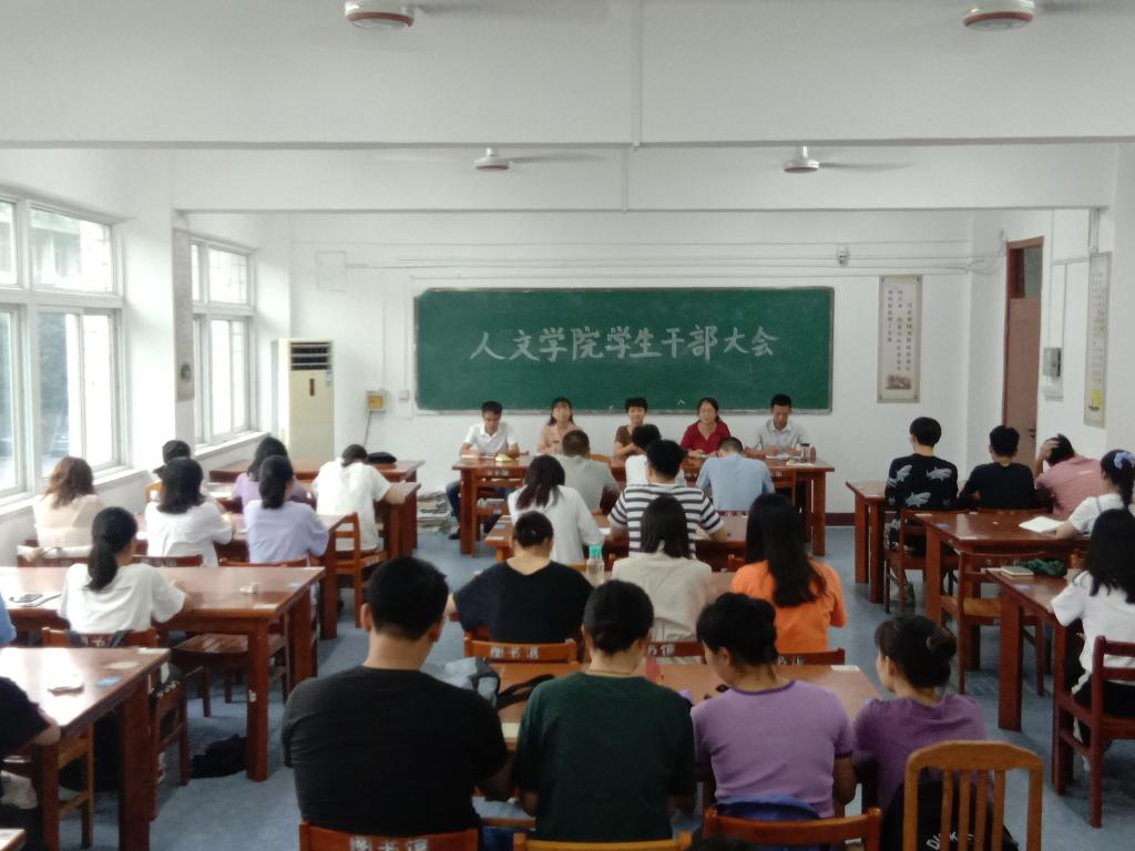 9月2日下午,人文学院在学知楼209召开新学期主要学生干部大会,党总支书记杜士凤,分团委书记李沙娜,辅导员曹珊珊、焦雪松出席会议,17、18、19级各班班长、团支书、学习委员参加会议。会议由李沙娜主持。