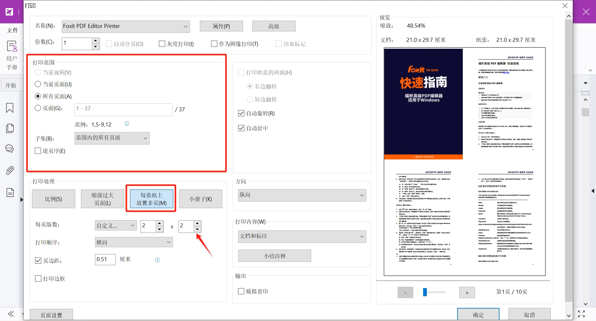 选好打印机,在打印范围中输入需要放置的页码,然后在打印处理中选择“每张纸上放置多页”,接着写下每页版数,如2*2或3*4等,可以在右侧预览图中看到最终效果。