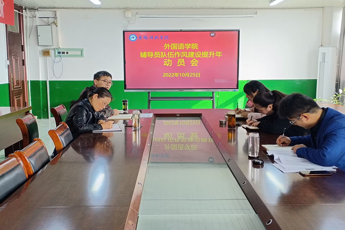 为提升辅导员做好新时代学生思想政治教育和日常管理服务的能力和水平,根据学校有关文件精神,10月25日下午,外国语学院在学院会议室召开辅导员队伍建设提升年动员会。外国语学院党委书记蔡为青、副书记张海亮以及全体辅导员参加会议,会议由张海亮主持。