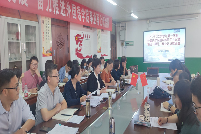 11月1日下午,外国语学院在学院会议室召开2023-2024-1学期期中教职工大会暨英语(师范)专业认证推进会,学院党政领导和全体教职工参加会议。会议由外国语学院院长刘萍主持。