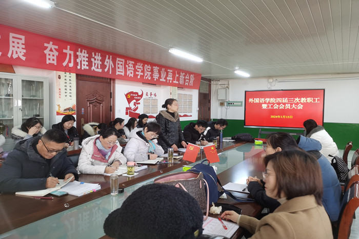 旧岁已展千重锦,新年正待谱新篇。2024年1月15日上午,外国语学院在学院会议室隆重召开四届三次教职工暨工会会员大会,回顾总结2023年工作,部署2024年目标任务。学院全体教职工参加会议,会议由学院党委书记蔡为青主持。