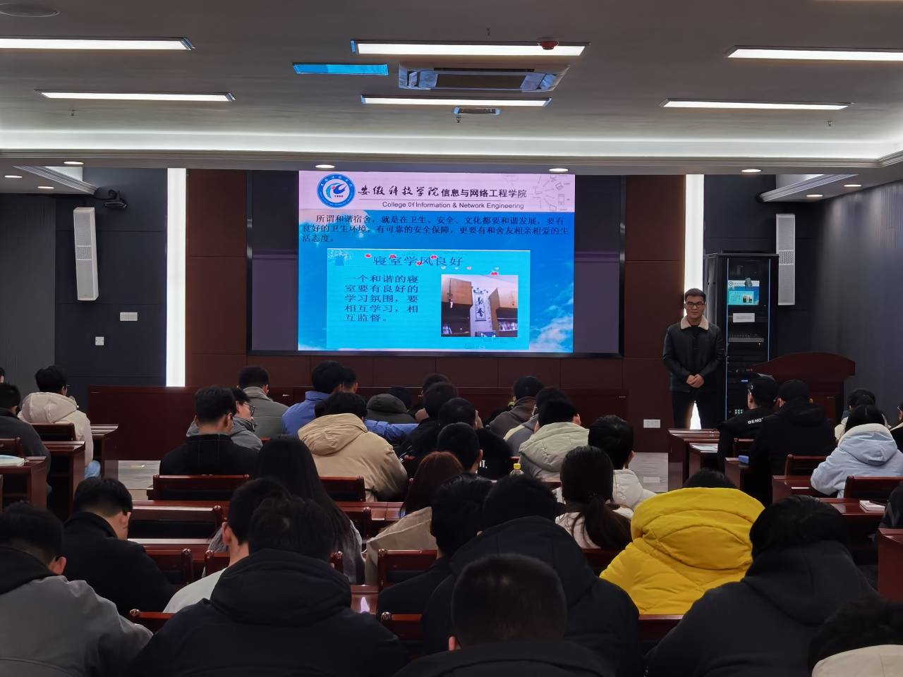 为进一步促进宿舍学风建设,构建和谐校园,创造规范、整洁、文明、舒适、优美的学生宿舍环境,12月13日下午,信息与网络工程学院于图书馆西辅楼111会议室举办文明和谐宿舍创建培训会。培训会由专职辅导员李军成主讲,学院2020级各班全体班干部,分团委、学生会和易班新入职成员参加了本次培训。