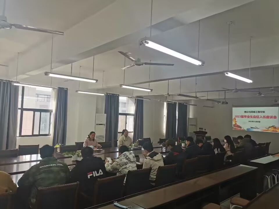为认真贯彻落实省征兵办、省教育厅及学校有关工作要求,扎实做好2023年学院大学生征兵宣传工作,12月5日,信息与网络工程学院在学院会议室召开2023届毕业生应征入伍座谈会。学院党委副书记韦乃学出席会议,2023届有应征入伍意向的毕业生参加会议,会议由学院征兵工作联系人丁阿敏主持。