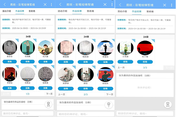 本次活动以"凝聚网络正能量,青春盛礼献祖国"为主题,通过艺术创作形式弘扬军人精神、培育爱国情怀。活动期间,学院精心组织、广泛动员,同学们积极响应、热情参与。经过线下评分和易班网络投票,最终李梦瑶同学的作品脱颖而出,荣获一等奖;钮贵海等三位同学获得二等奖;钱跃庭等五位同学获得三等奖。