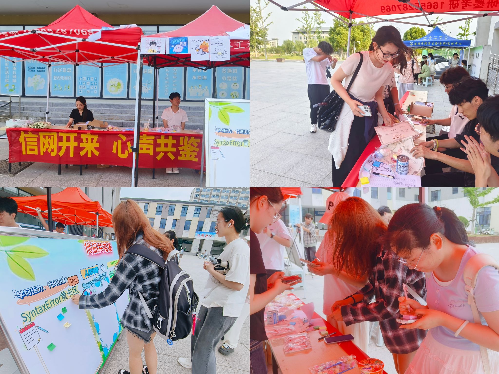 为丰富大学生的业余生活,进一步强化学生心理健康指数,2025年5月21日,于龙湖校区一站式社区服务中心前广场开展了以“信网开来,共鉴心声”为主题的心理游园会系列活动。此次游园会包含主线活动“代码共鸣墙”和支线活动“DIY手链——‘串起散落的情绪’”。本次活动的成功举办,不仅为同学们普及了心理健康知识,更以寓教于乐的创新形式,引导大家在轻松愉悦的氛围中构建积极向上、理性平和的健康心态,有效提升了活动的吸引力和教育实效。